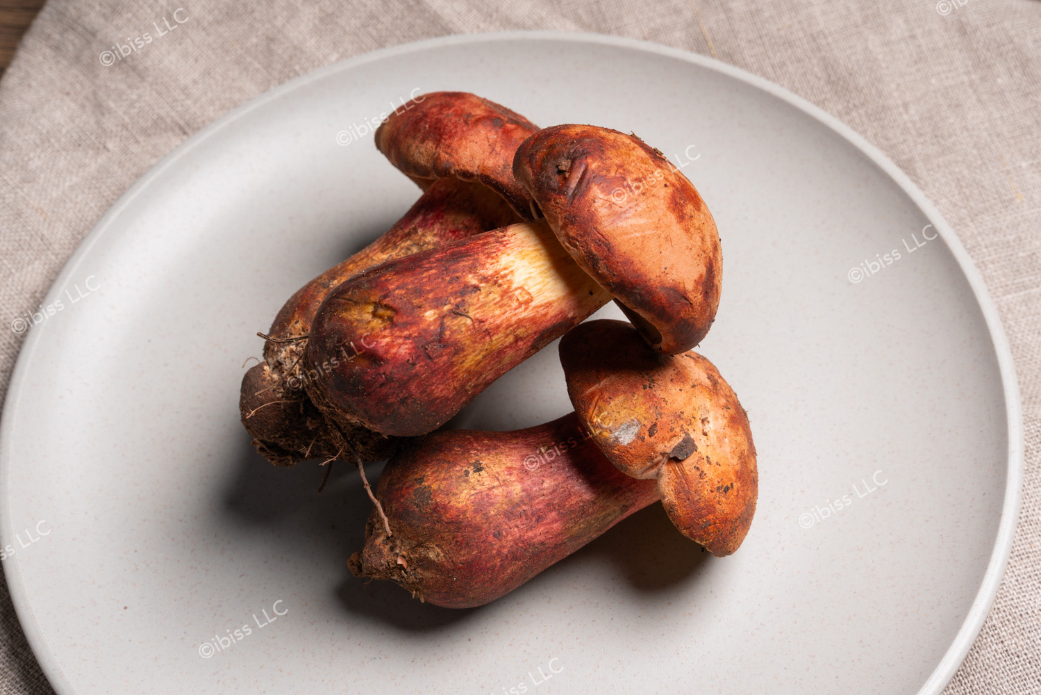 紅色のかさと柄、手で触ると青変する特徴的な色変化を持つ野生キノコです。食感はしっかりとしており、加熱後は独特の香りと旨味が楽しめます。ただし、毒性成分を含むため、十分な加熱(20分以上)が必要です。
